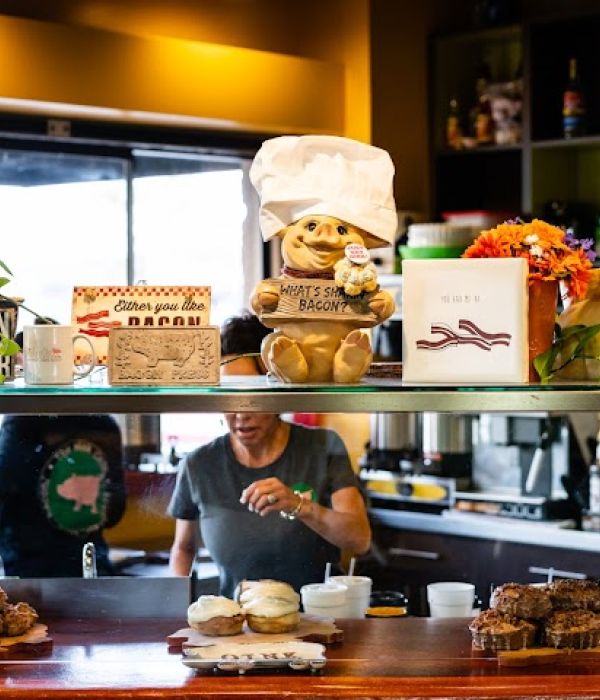 modern café serving homemade breakfast and lunch, handcrafted espresso drinks, premium beer, cocktails, and above all else BACON! 8 delicious flavors of bacon. You may commence drooling!
